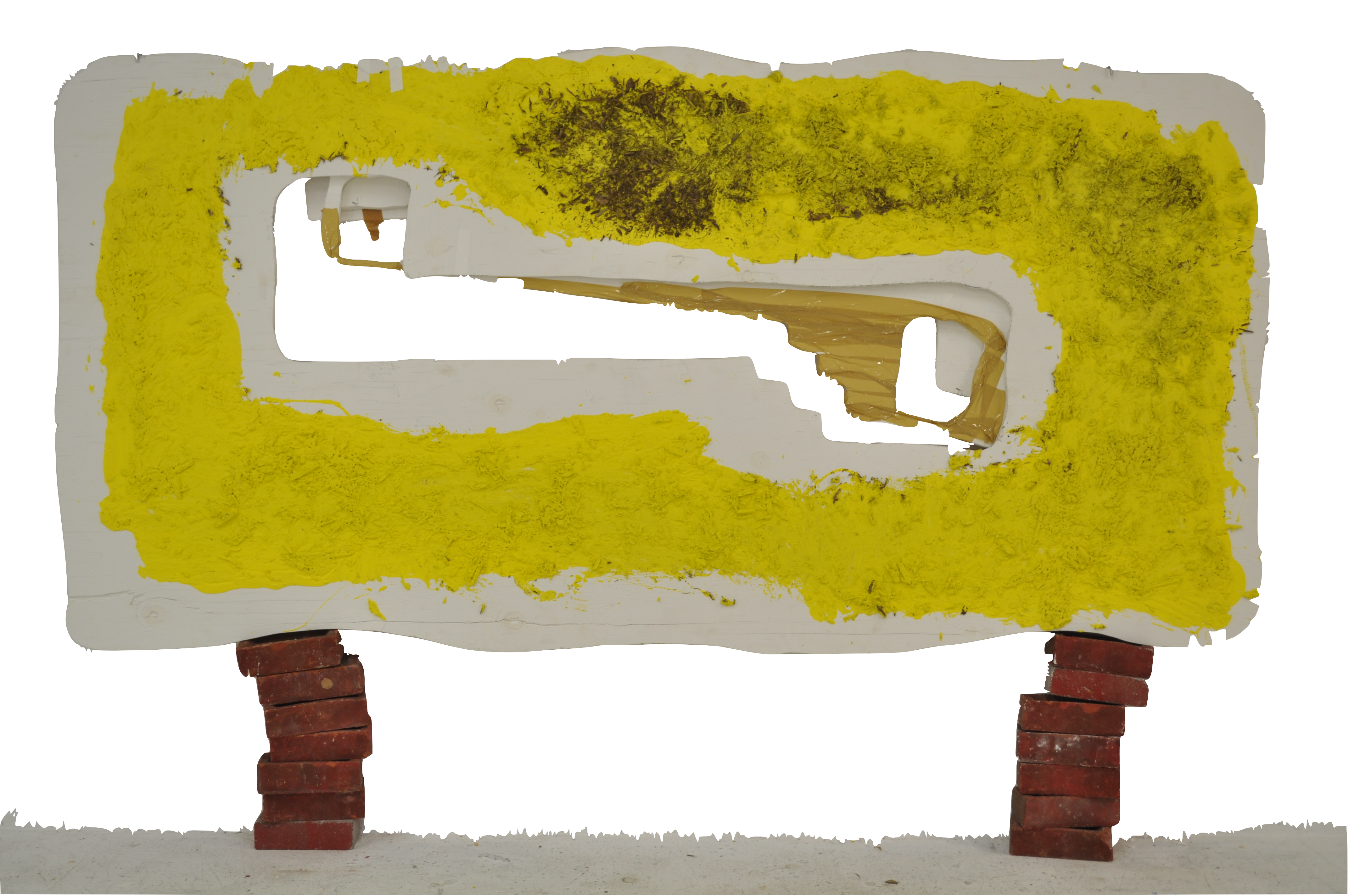 mulch, packaging tape, and paint on plywood (3x7 ft.)